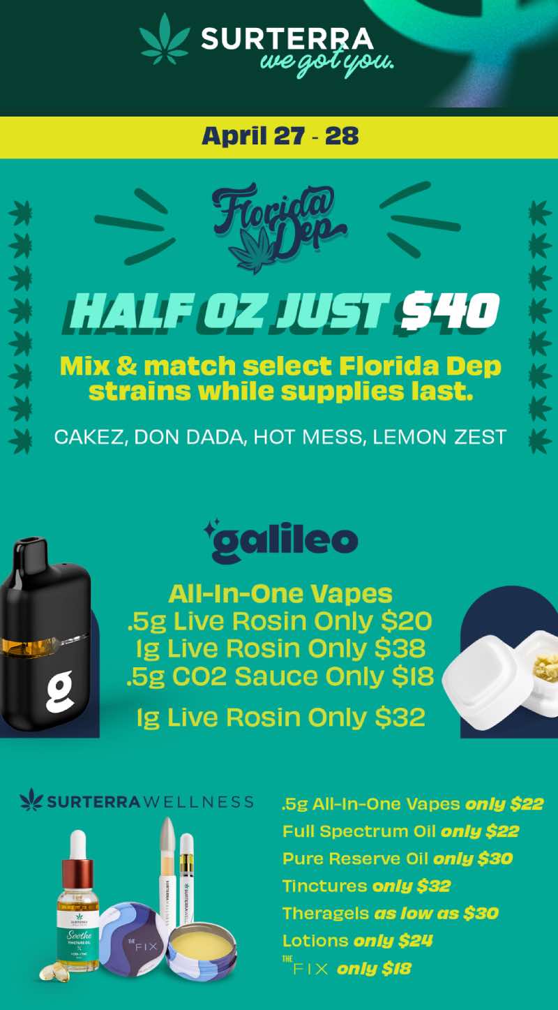 Half Oz Just $40 on select Florida Dep strains